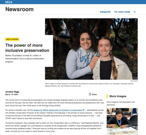 The UCLA/Getty Interdepartmental Program in the Conservation of Cultural Heritage has received three generous grants from the Andrew W. Mellon Foundation to help address underrepresentation in the study and practice of conservation. The first grant supported a four-year pilot program (2017-2020), the second supported phase two (2020-2023), and building on the successes of the prior years, phase three (2024-2026) is underway! Read about the most recent Mellon Foundation investment and the power of more inclusive preservation at the UCLA Newsroom.
